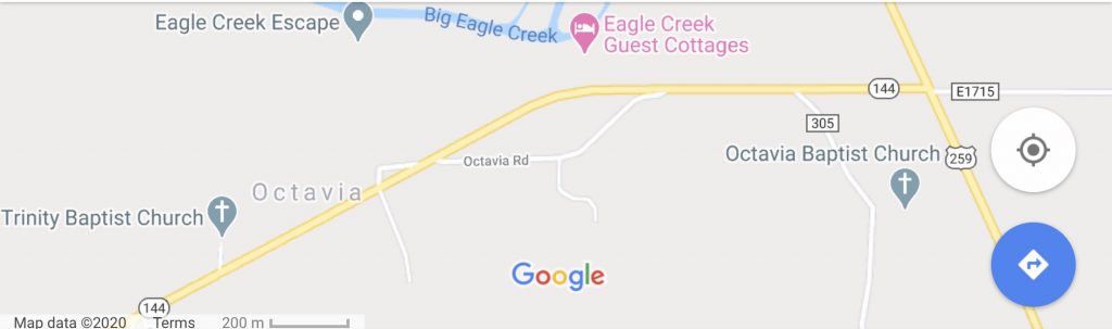 We are located on Indian Highway 144, 1 mile west of the highway 144/259 intersection. We have three signs in place for easier direction. First being on the North Side of the 144/259 intersection (across from the Octavia Volunteer Fire Department). Second being at the beginning of Octavia Road (one mile west from the highway intersection). The last sign is at the church drive way (1/10 of a mile down the Octavia Road) next to the old Octavia school.